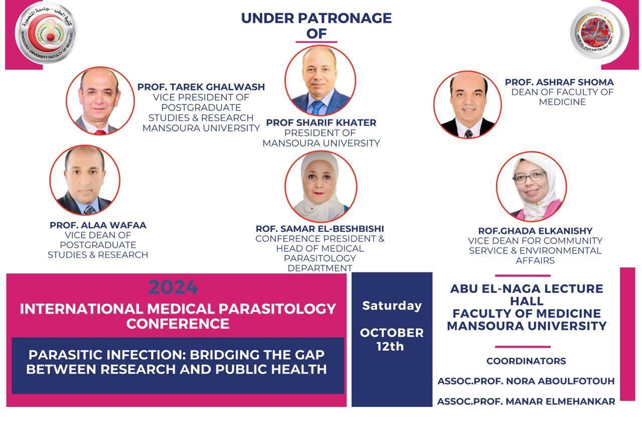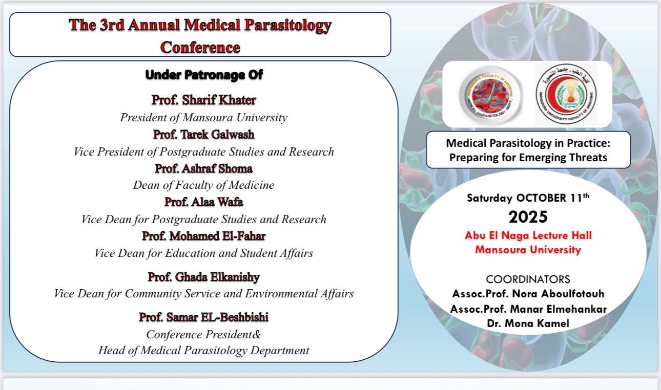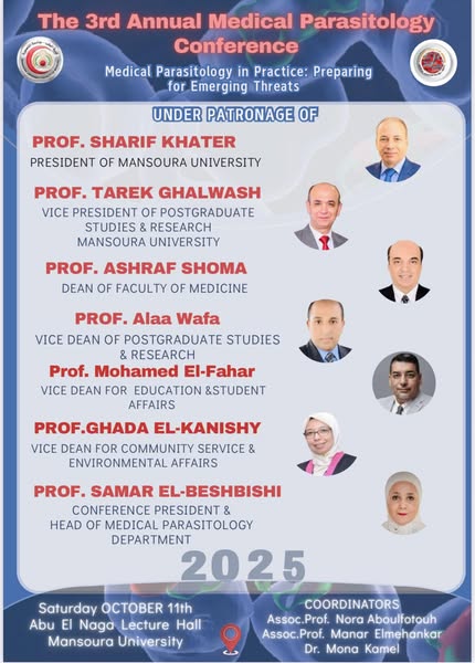 يسرنا أن نعلن عن مؤتمر الطفيليات الطبي الثالث 2025 الذي سيعقد يوم السبت 11 أكتوبر 2025 بقاعة محاضرات أبو النجا بكلية الطب جامعة المنصورة، مع التركيز على موضوع "علم الطفيليات الطبية في الممارسة: التحضير للتهديدات الناشئة"