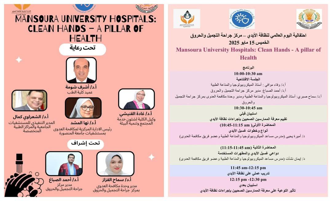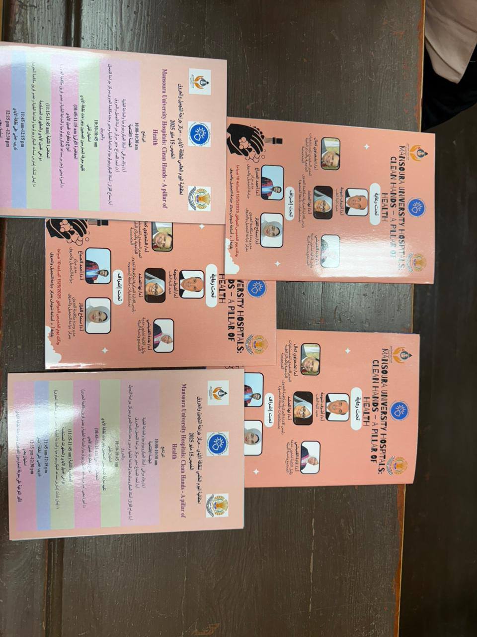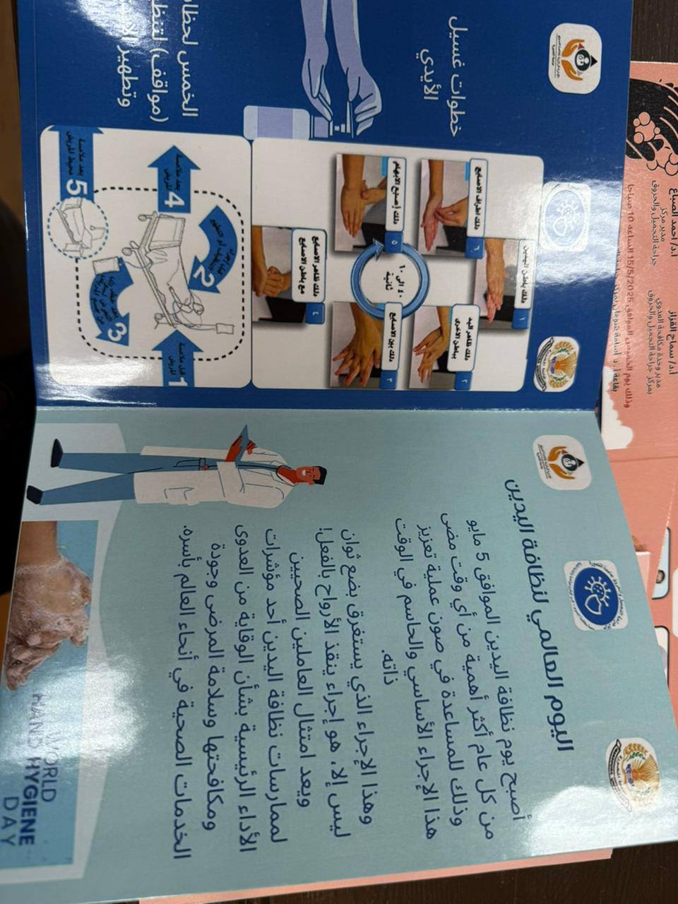 تم اليوم الخميس ١٥ مايو ٢٠٢٥ الاحتفال باليوم العالمى لغسيل الأيدى وذلك بتوجيه محاضرات توعويه عن الطرق المثلى لغسيل الايدى وأنواع المطهرات المختلفه وكيفيه استخدامها كأحد اهم وأبسط الطرق لمكافحة العدوى داخل المنشآت الصحيه
