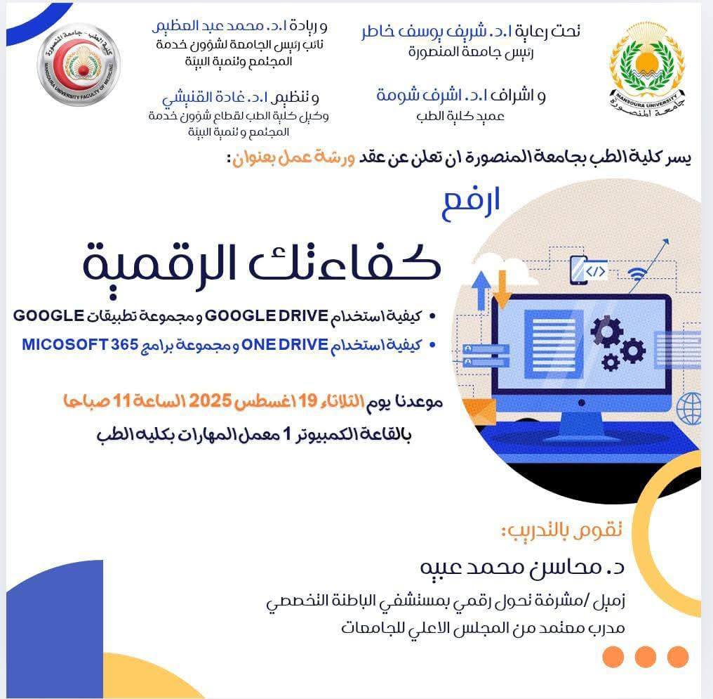 تم ذلك يوم الثلاثاء الموافق 19 أغسطس 2025، في قاعة الكمبيوتر 1 بمعمل المهارات – كلية الطب، جامعة المنصورة.