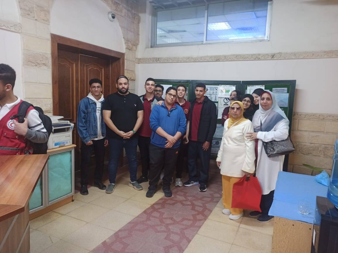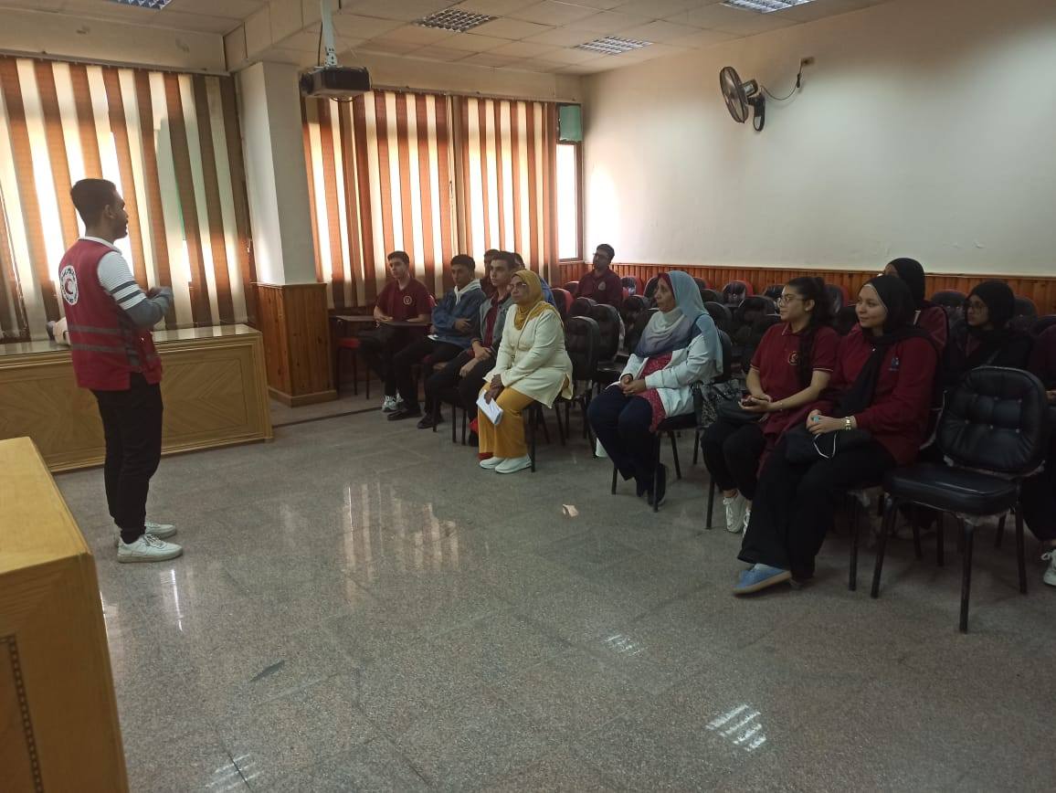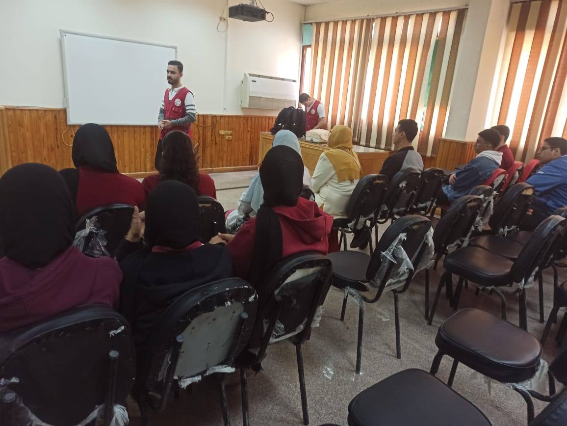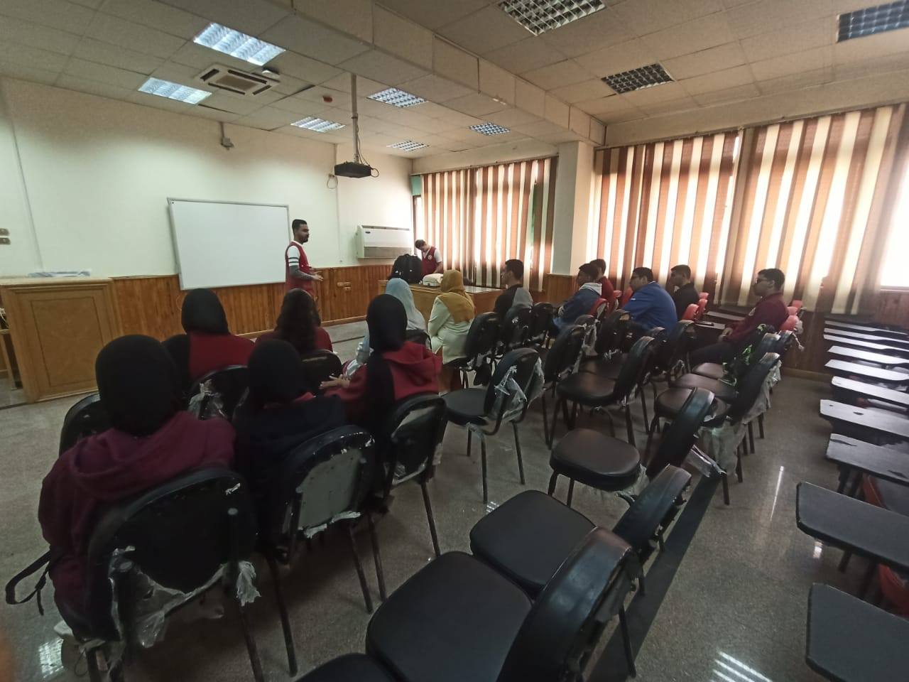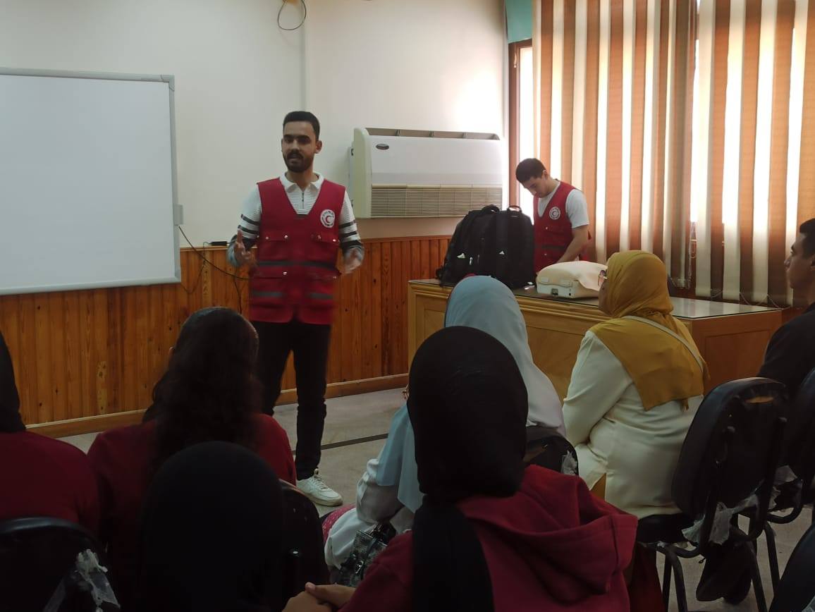 في معمل المهارات لعمل جوله بالمعمل قامو الأطباء الامتياز المتطوعين من فريق الهلال الأحمر/ أحمد أمير علي & محمد ياسر برهام - بالتدريب علي الإسعافات الأولية والمسح الأولي للميدان و وضعيه الافاقه والجروح والجبائر والتشنجات