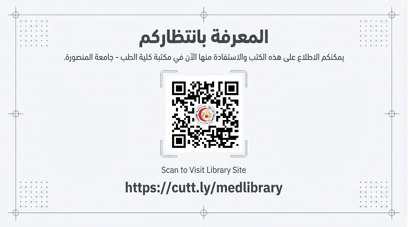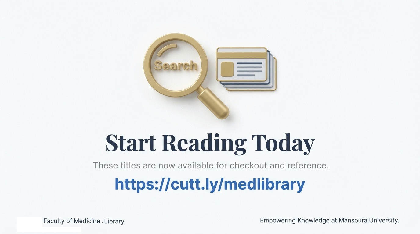 يسرّ مكتبة كلية الطب جامعة المنصورة أن تعلن لمستفيديها الكرام عن وصول مجموعة جديدة ومميزة من أحدث الكتب الطبية لدعم العملية التعليمية والبحث العلمي، وإثراء مصادر المعرفة لطلاب الكلية والباحثين وأعضاء هيئة التدريس