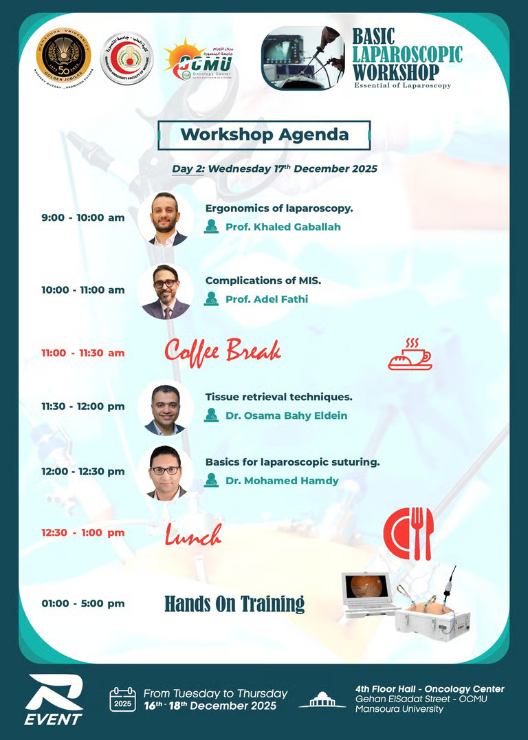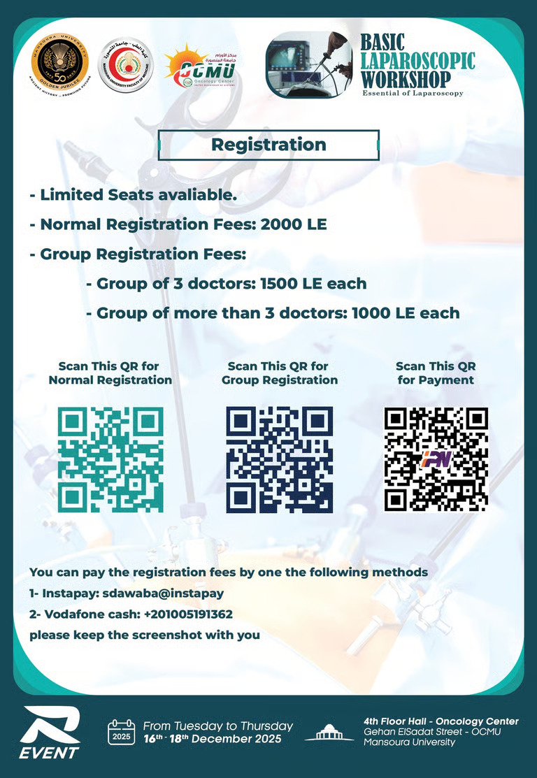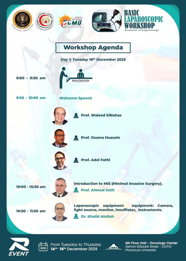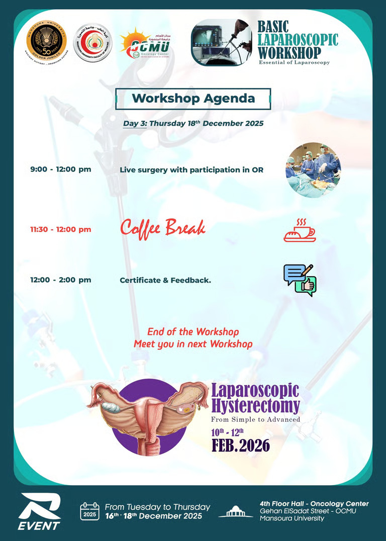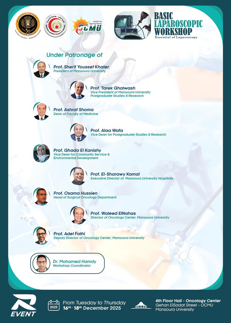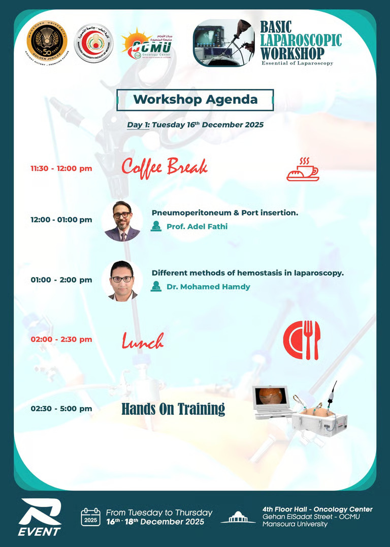 ندعوكم لحضور ورشة عمل المناظير الجراحية يوم 16 ديسمبر 2025 ويتبعها مجموعة ورش عمل على مدار العام القادم في مستشفى الأورام بجامعة المنصورة